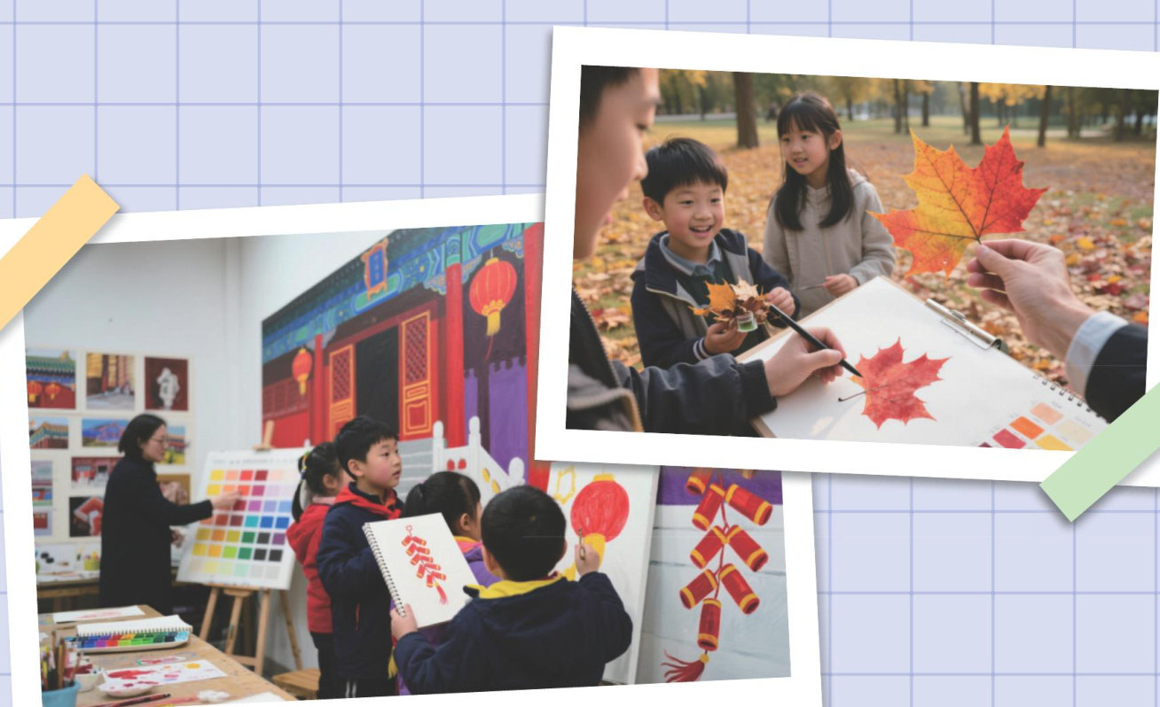 晨光里的调色实验 九月的阳光斜斜地洒进画室,课代表小林对着调色盘发愁:“老师,为什么我调不出天空蓝呢?”他面前堆着各色颜料,钴蓝和钛白反复混合,最后还是带着一股沉闷的灰调,连画纸上的云朵都显得没精打采。 我捡起一枚半红半黄的枫叶:“叶脉边缘的橙红其实是红与黄的渐变色,而且不同的枫叶,红色的饱和度也不一样。我们用大红加柠檬黄调出橙色,再加少许群青,就能让色彩更踏实,像成熟的果实。”突然,小雨指着
