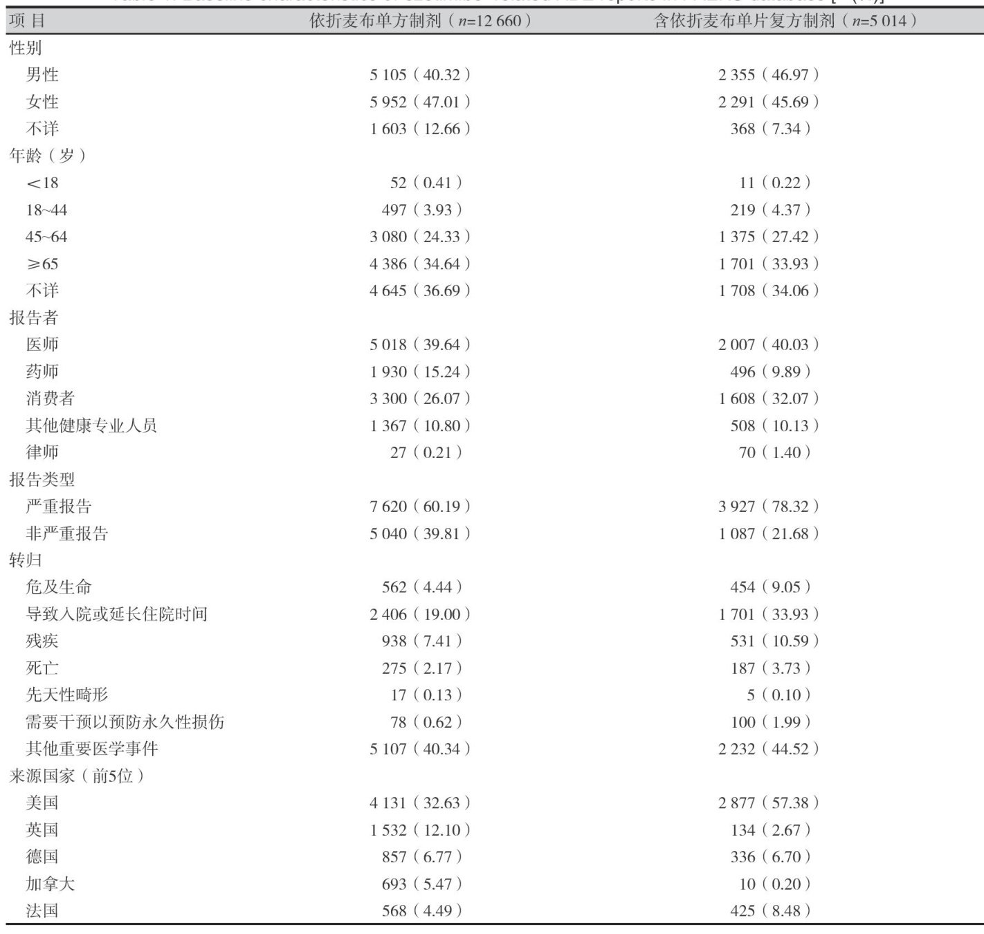 【摘要】目的挖掘并分析依折麦布单药与含依折麦布单片复方制剂的不良事件(ADE)信号,为临床安全用药提供依据。方法提取美国食品药品管理局不良事件报告系统(FAERS)数据库2004年第1季度至2024年第4季度上述药物的ADE报告数据,采用报告比值比法、比例报告比值法、英国药品和医疗保健产品管理局的综合标准法、贝叶斯置信度递进神经网络法和多项式伽马泊松分布缩减法等方法进行信号挖掘和分析。结果共纳入依折麦布相关ADE报告17674份,其中单方制剂12660份,单片复方制剂5014份。单方制剂和单片复方制剂的ADE信号数分别为234和142个,涉及27个系统/器官分类(SOC),其中肌肉骨骼及结缔组织疾病报告数最多。在报告数排名前十位的ADE中,肌痛、肌痉挛、关节痛、肢体疼痛、血肌酸磷酸激酶升高和横纹肌溶解为阳性信号。呼吸困难、步态障碍、急性肾损伤等ADE未在药品说明书中记载。依折麦布单方制剂与单片复方制剂的风险信号总体保持一致。与单方制剂相比,单片复方制剂新增了急性肾损伤的风险信号,而胃肠道相关ADE(如腹痛、上腹痛和腹部不适)未提示风险。结论依折麦布单药与单片复方制剂总体安全性相似,临床实践中,需警惕依折麦布与他汀类药物联用可能带来的肌肉毒性累积风险,并加强对呼吸困难、步态障碍和急性肾损伤等说明书未记载ADE的主动监测。