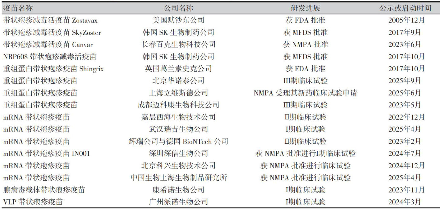 【摘要】带状疱疹是由潜伏于神经节中的水痘-带状疱疹病毒再激活引发的簇集性水疱皮肤病,常伴有严重的后遗症与并发症,不仅会显著降低患者的生活质量,还易引发心理负担。接种疫苗是预防带状疱疹最有效且经济的方案。带状疱疹重组蛋白疫苗是当前带状疱疹疫苗接种的主流选择。随着带状疱疹发病率的增高,国内外各生物制品企业积极研发信使RNA(mRNA)及各类型的带状疱疹疫苗,有效填补了我国相关领域的研发空白。本文系统综述带状疱疹的临床表现、流行病学特征,并对带状疱疹减毒活疫苗、重组蛋白带状疱疹疫苗、mRNA带状疱疹疫苗、腺病毒载体带状疱疹疫苗和病毒样颗粒带状疱疹疫苗等当前上市及在研带状疱疹疫苗的研发进展进行梳理与分析,为该领域的研究和应用提供参考。