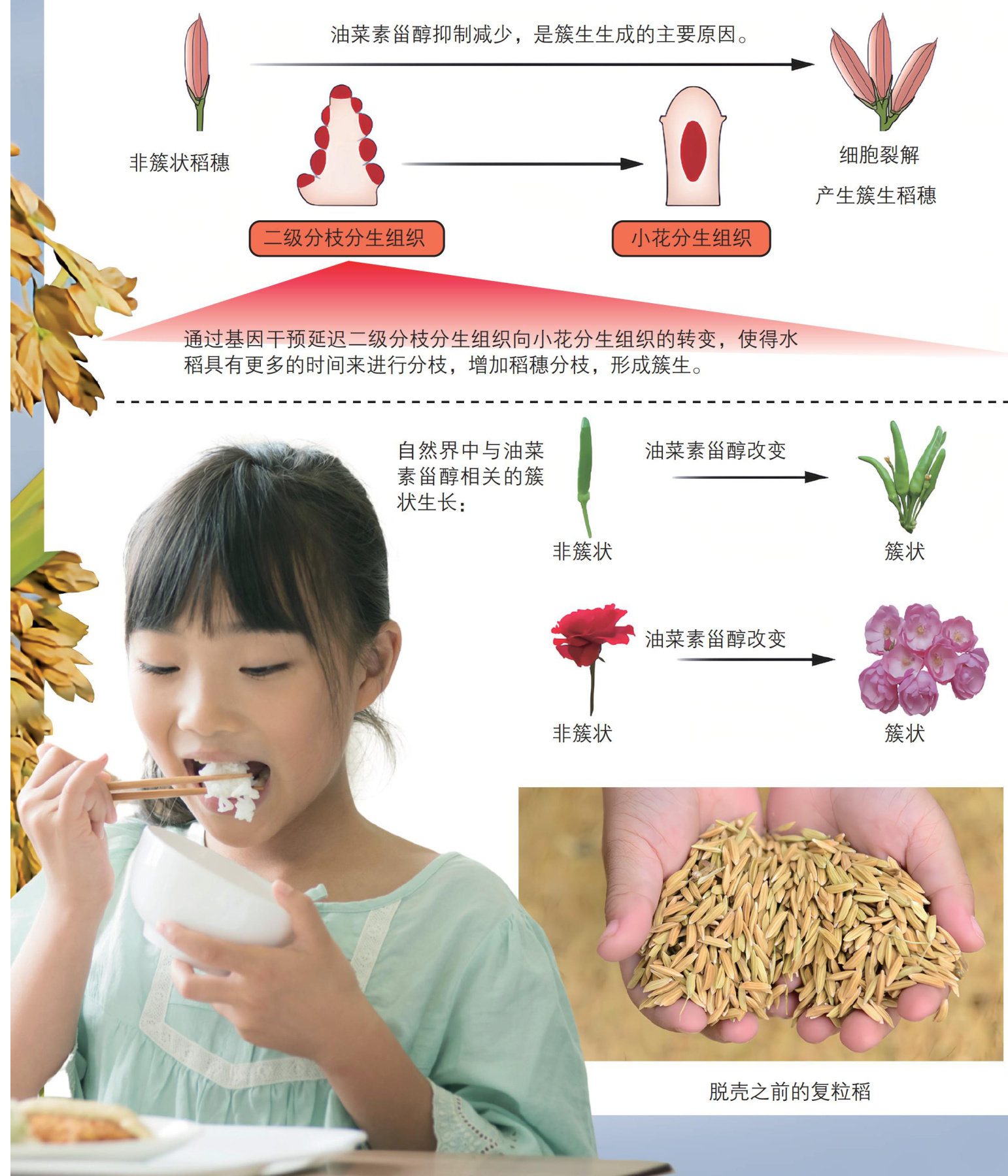 你听说过复粒稻吗?它是一种独特的水稻,穗上长满了像葡萄一样簇生的小稻粒,有趣极了。20世纪30年代起,印度、美国、日本等世界各国的遗传学家注意到了这种特殊的水稻品种。然而,它的遗传机制一直是个谜。 近几年,的科学家终于在破解这个谜题的里程上更进了一步。他们发现:复粒稻穗粒簇生的特性跟一种叫油菜素甾醇(BR)的植物激素有关,它控制着水稻穗上的颗粒数。这个发现为人们培育高产水稻提供了新思路。随着研究