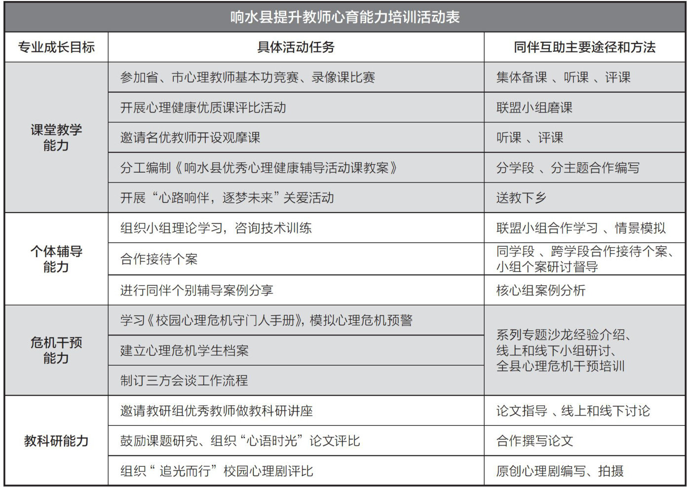 心理教师是一个高度专业化的职业,其专业素养的高低与心理健康教育质量的优劣直接相关。在江苏省关爱青少年心理健康“润心行动”工作的推动下,响水县组建了专职心理教师队伍。总体来说,这支年轻的教师队伍热情饱满,但缺乏系统的专业培训,亟待提升教学能力。我们对响水县心理健康教育现状进行详细调研,以心理教师发展的现实需求为核心,以提升心理教师职业胜任力为目标,根据教师的职业发展规律,开展系列专业化培训,有效推动