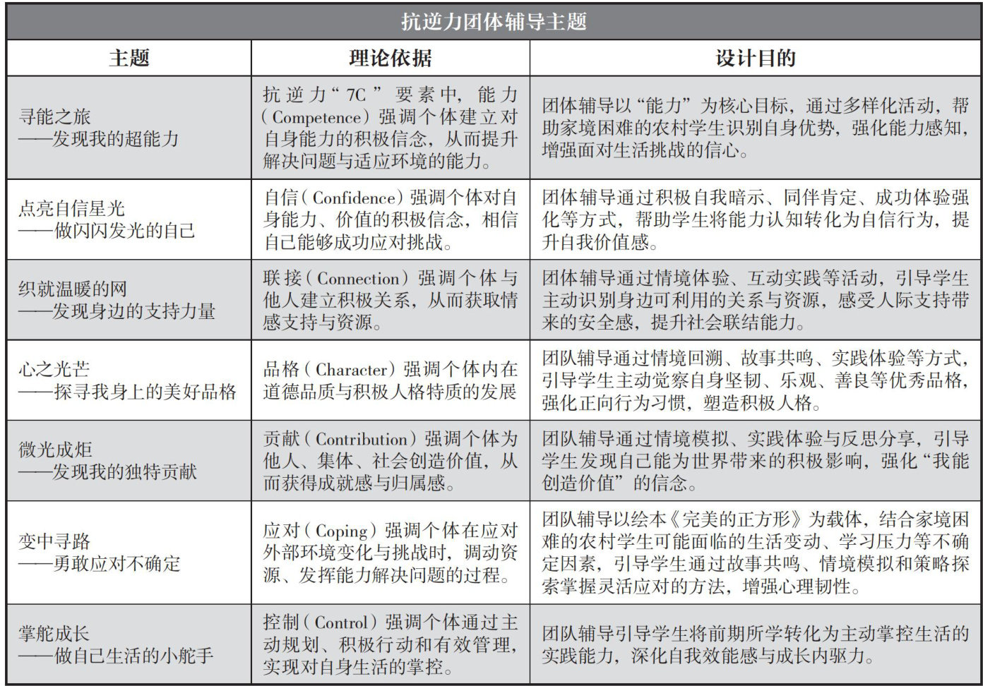 家境困难的农村学生在成长过程中,不仅会面临经济物质的匮乏,还需应对情感支持缺失、人际交往不畅、自我效能感偏低等心理挑战。如何帮助这些学生在逆境中实现积极发展?抗逆力理论为这一问题的解决提供了新的视角。该理论包含“7C”要素,强调个体抗逆力由能力(Competence)、自信(Confidence)、联结(Connection)、品格(Character)、贡献(Contribution)、应对(C